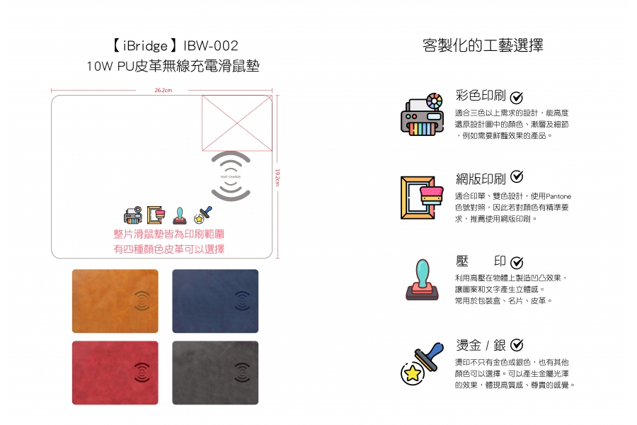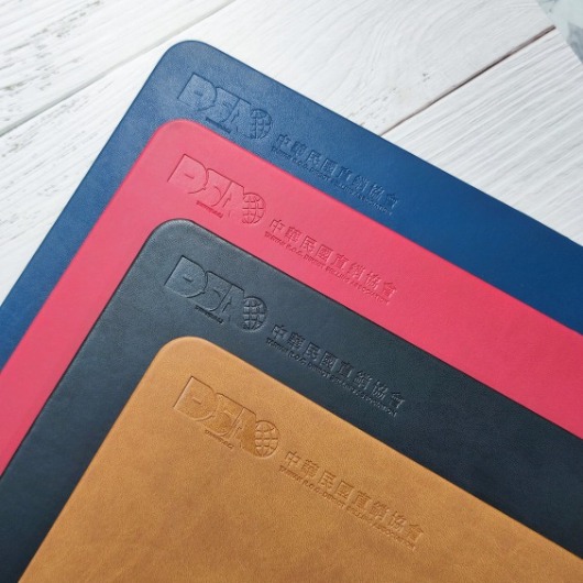 皮革材質可施作技術:網版 Screen printing、彩印 Color printing、壓印 Embossing、燙金/銀 Hot stamping;不可施作:雷射雕刻 Laser engraving