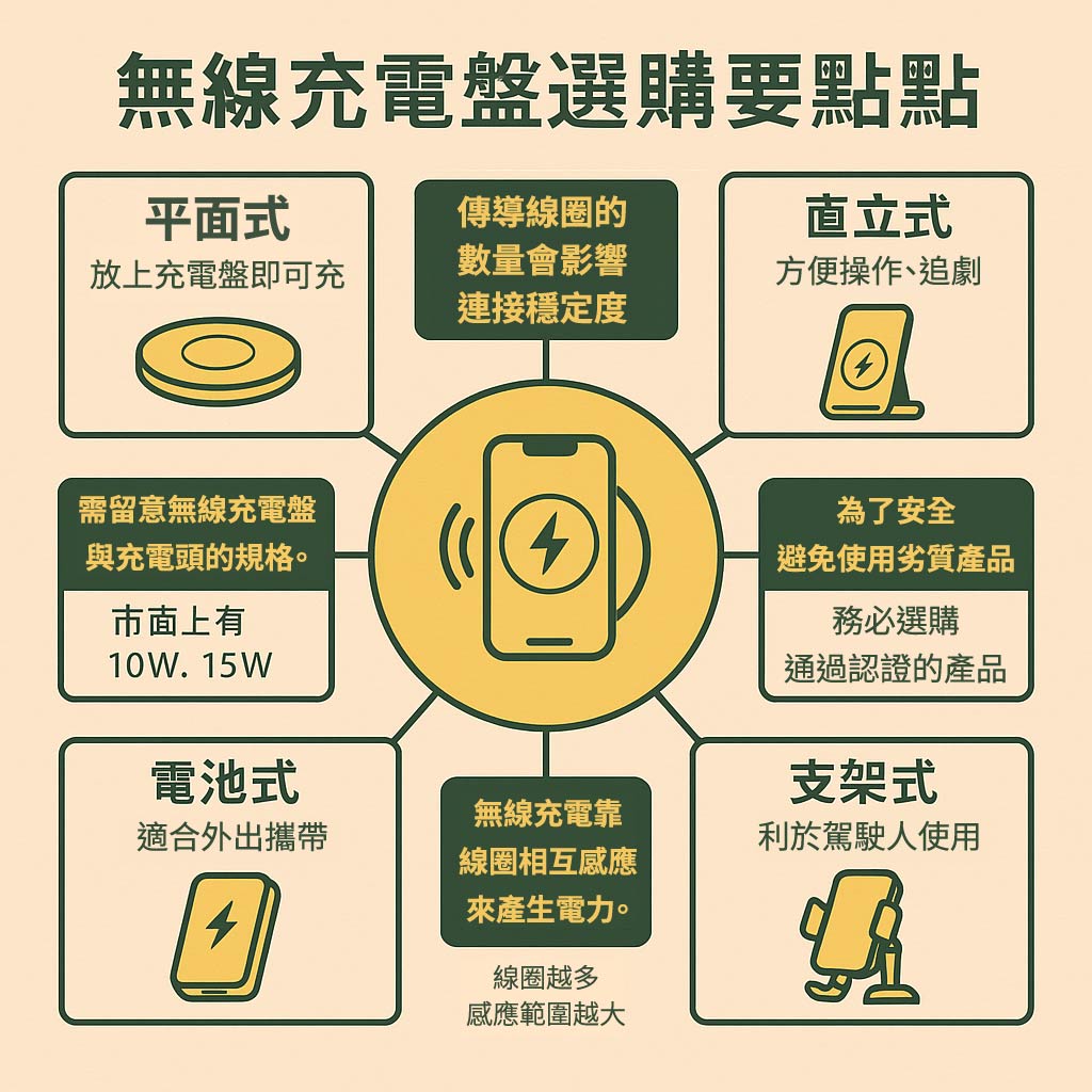 市面上常見無線充電盤的快充瓦數多是10W、15W,如果輸入給無線充電盤的功率不足,就無法發揮它的快充功能,在購入時需要同時留意無線充電盤與充電頭的規格。