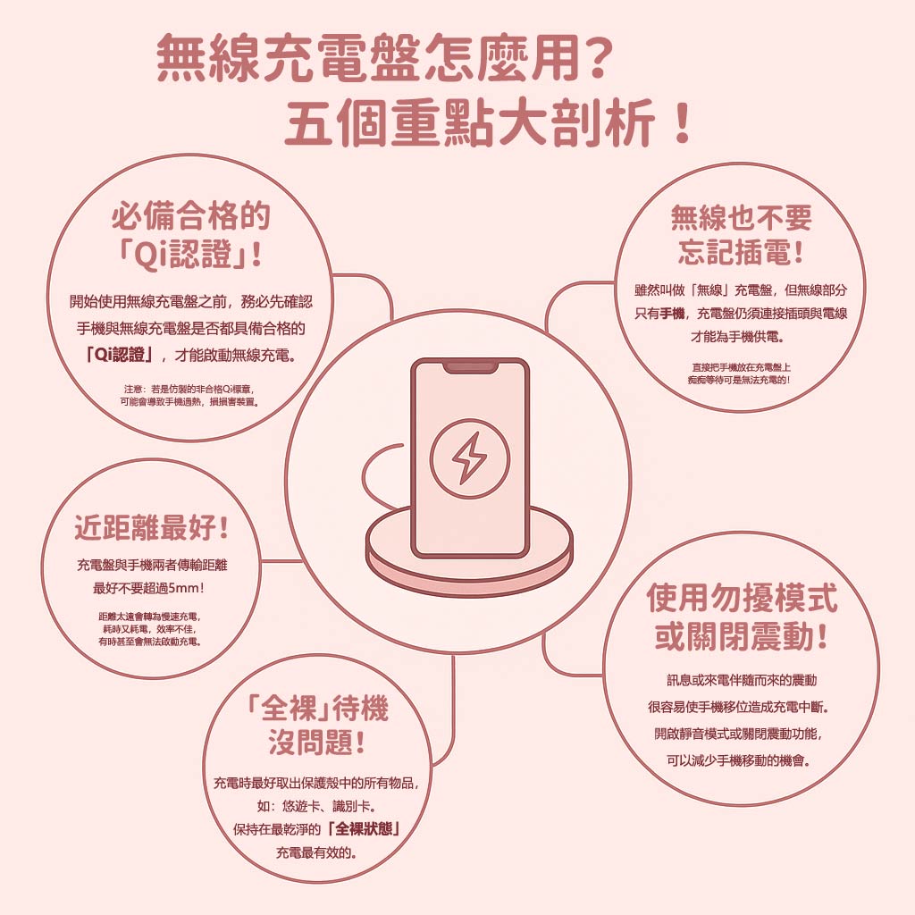 只要把握以上五個要件,就可以正確又安心的使用無線充電盤了!