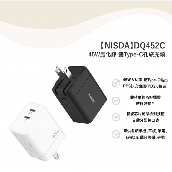 【NISDA】DQ452C - 45W氮化鎵 雙Type-C孔旅充頭