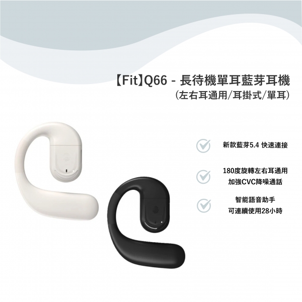 【Fit】Q66 - 長待機單耳藍芽耳機 (左右耳通用/耳掛式/單耳)