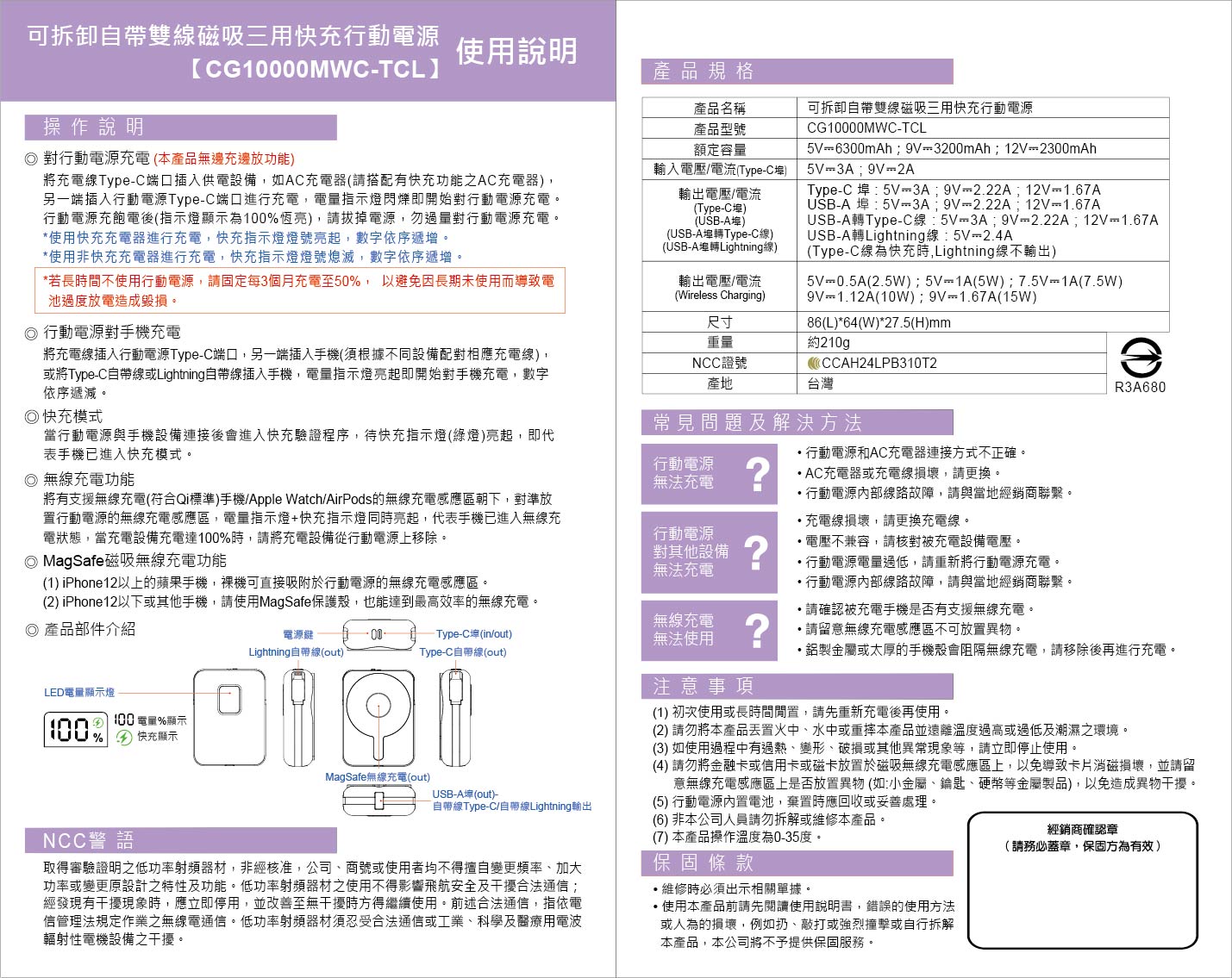 CG10000MWC-TCL - 可拆卸自帶雙線 / 磁吸三用 快充行動電源 (手機/手錶/耳機)