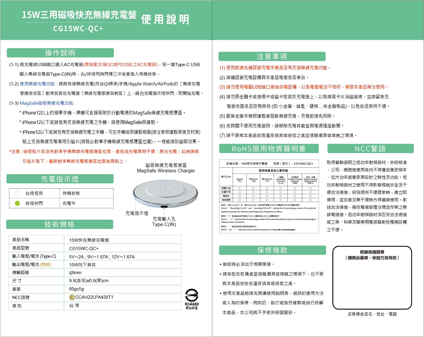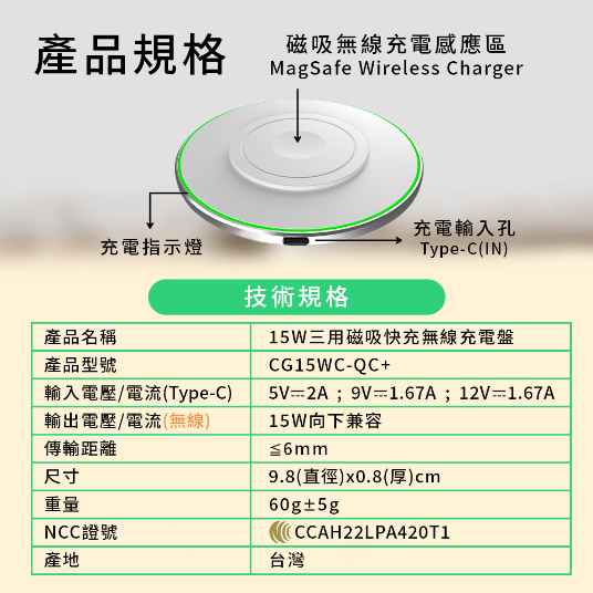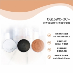 CG15WC-QC+ - 15W磁吸快充 無線充電盤 • 可充手機 / Apple Watch / Airpods • MagSafe磁吸快充 • 超薄輕巧外型 方便攜帶 另有客製化印刷服務←點此可看更多資訊!歡迎詢問! 更多其他產品 客製化印刷