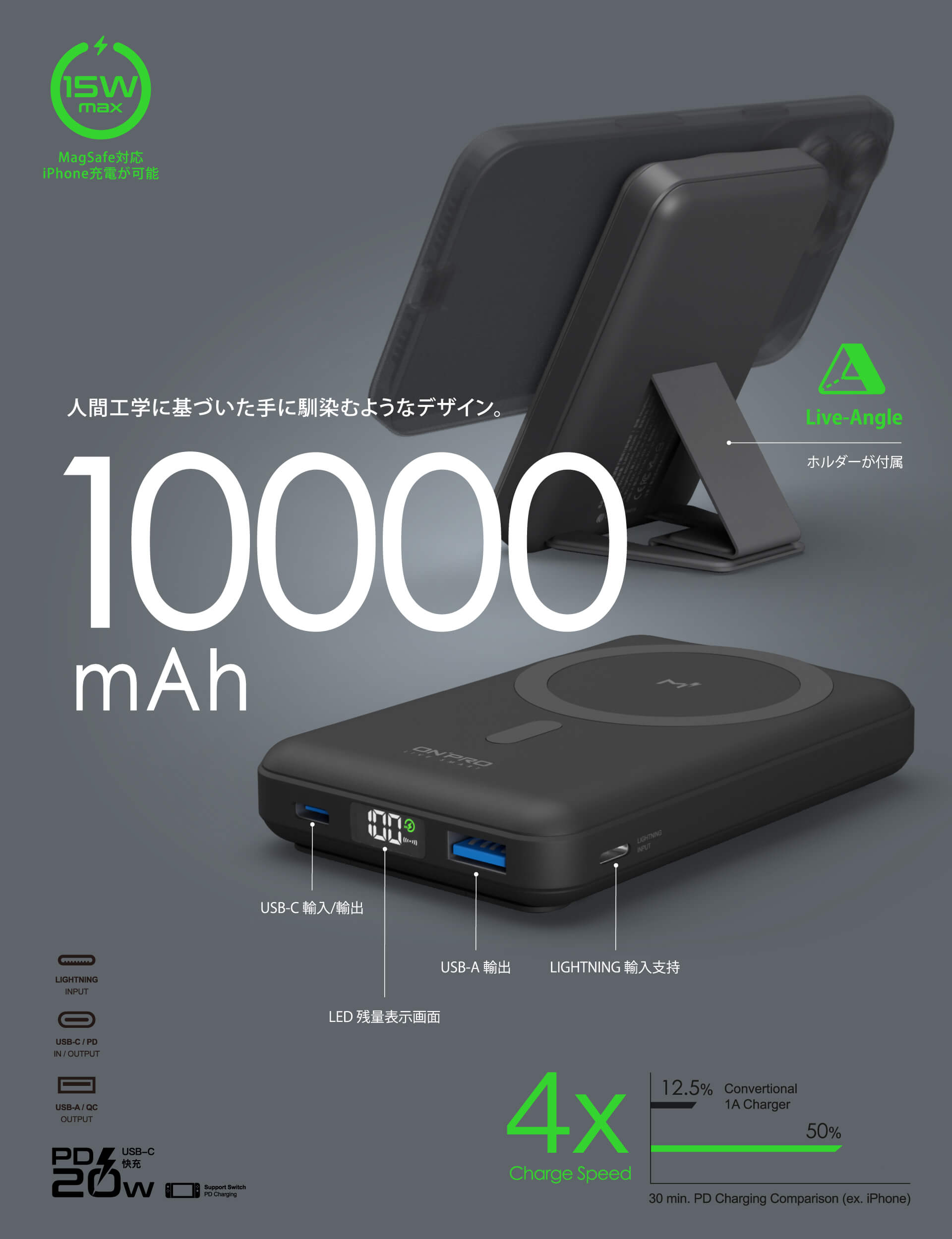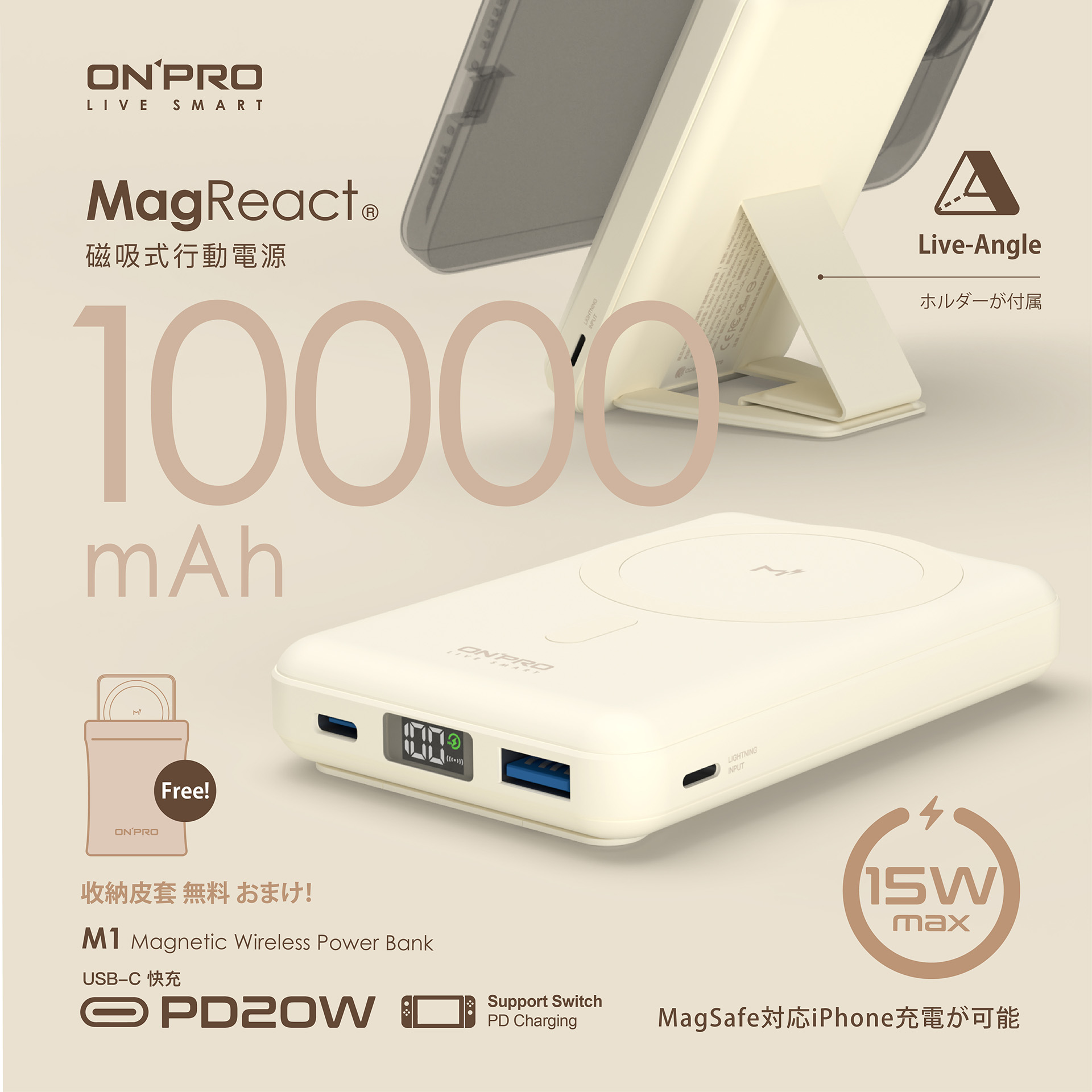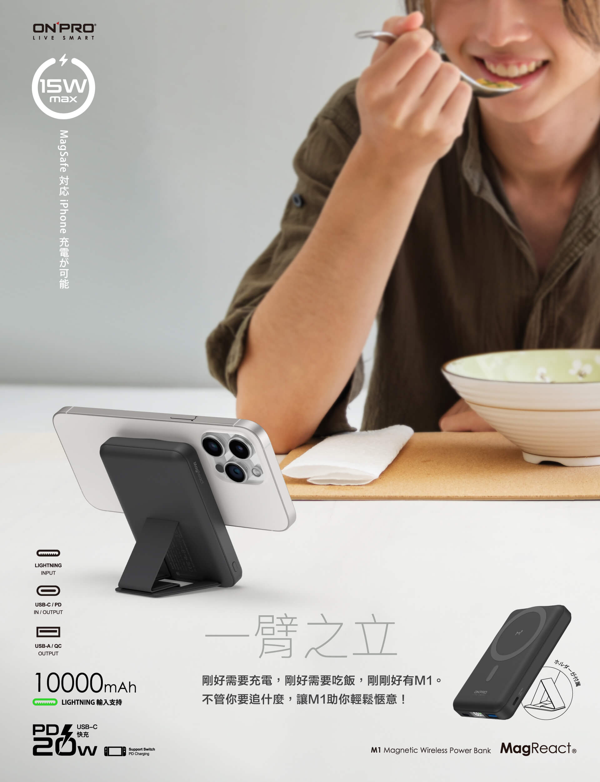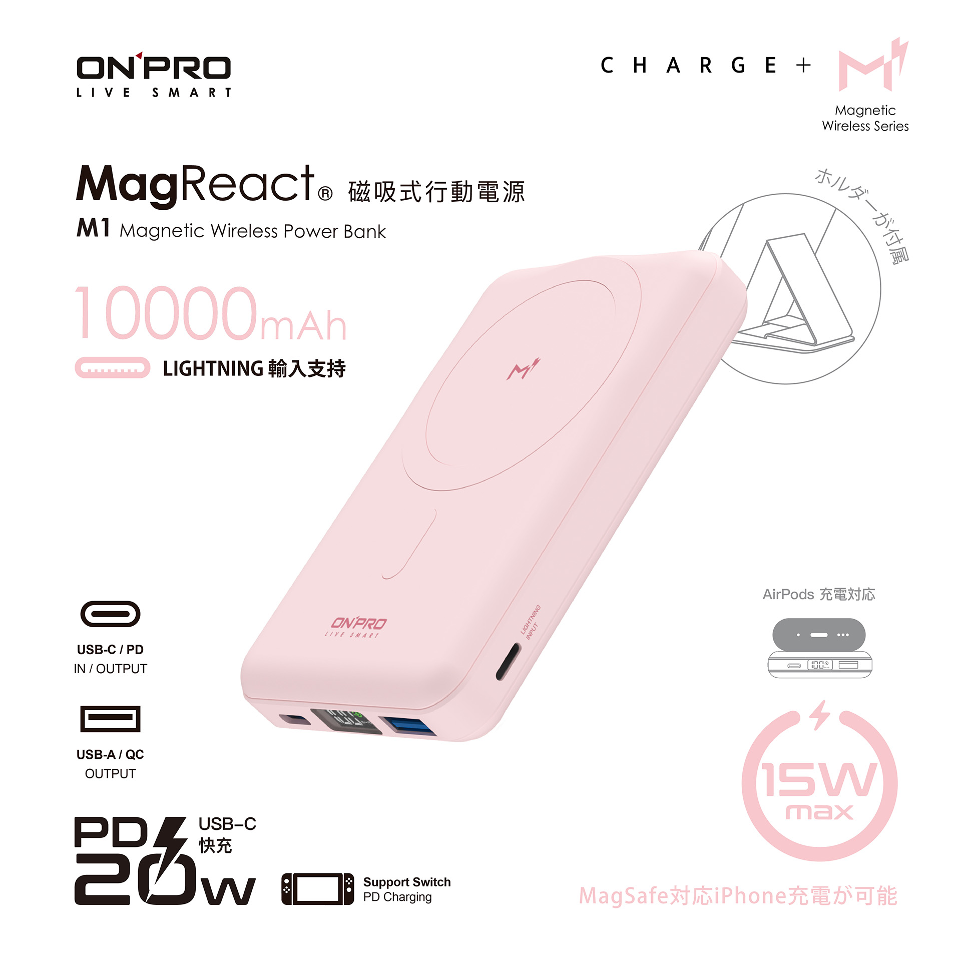 【ONPRO】MagReact™ M1 - 多功能磁吸式10000mAh行動電源 • 磁吸設計 • 超大容量 • 馬卡龍色系 另有客製化印刷服務 點此可看更多資訊! Read More 更多其他產品 客製化案例