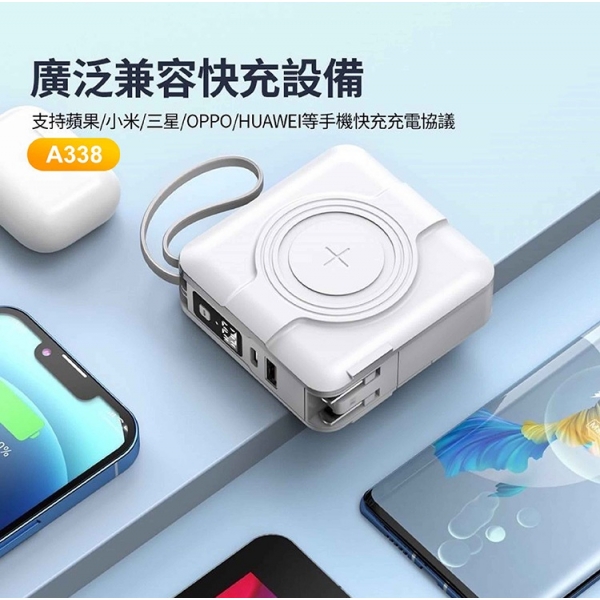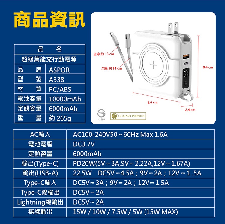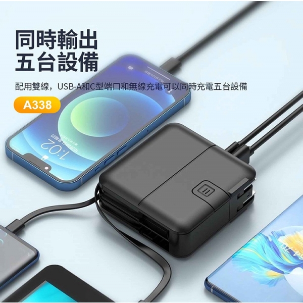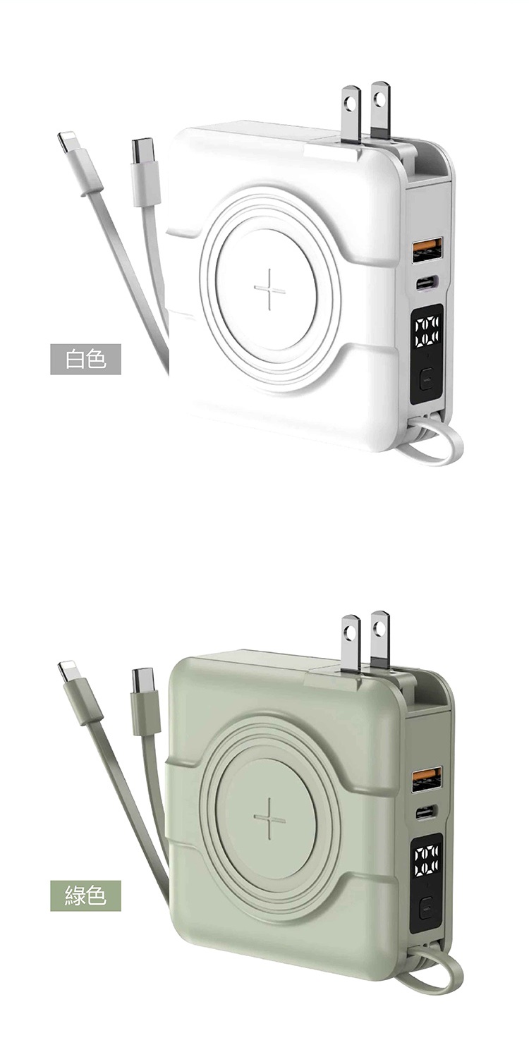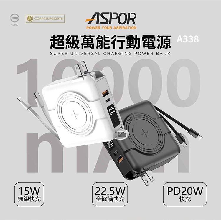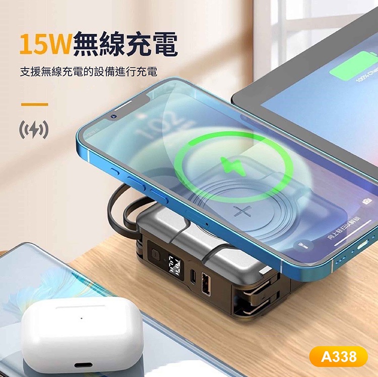 【ASPOR】A338 - 五合一自帶線 超級萬能10000mah行動電源 • 超級萬能 • 自帶雙線+支援無線充電 • 同時輸出五台設備 另有客製化印刷服務 點此可看更多資訊!歡迎詢問! Read More 更多其他產品 客製化案例