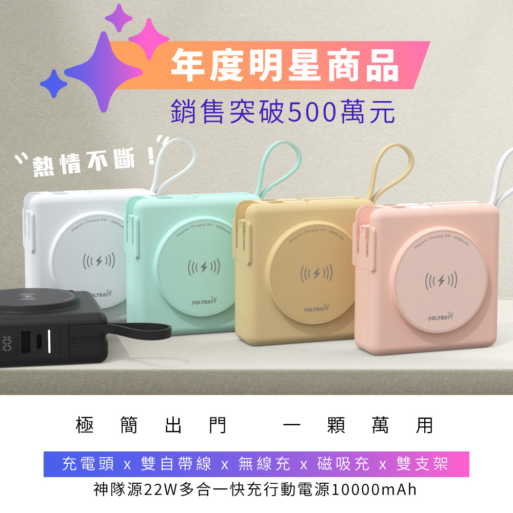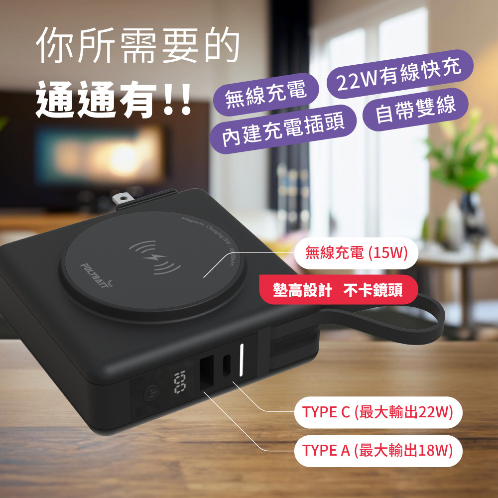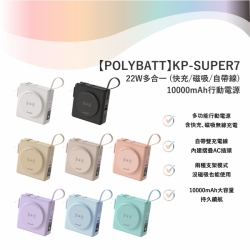 【POLYBATT】KP-SUPER7 - 22W多合一10000mAh行動電源 •雙線雙支架 •內鍵摺疊AC插頭 •附乘機專用袋 另有客製化印刷服務 點此可看更多資訊!作品持續更新中!歡迎詢問! Read More 更多其他產品 客製化案例
