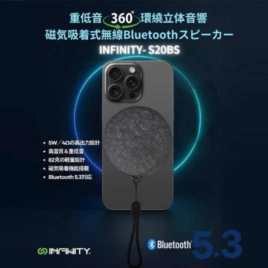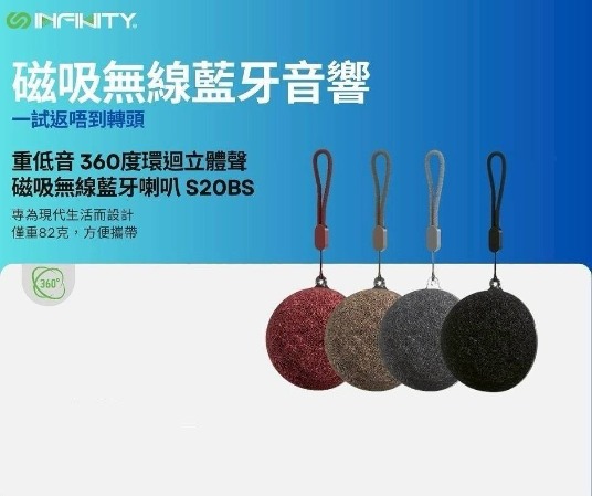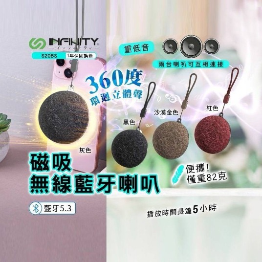【INFNITY】S20BS 磁吸無線藍芽喇叭 ‧ 重低音 360度環迴立體聲 ‧ 超輕82g 方便攜帶 讓您隨時隨地享受音樂 ‧ 藍牙5.3技術 快速配對 穩定連接 距離可達10米 另有客製化印刷服務←點此可看更多資訊!歡迎詢問! Read More 更多其他產品 客製化案例
