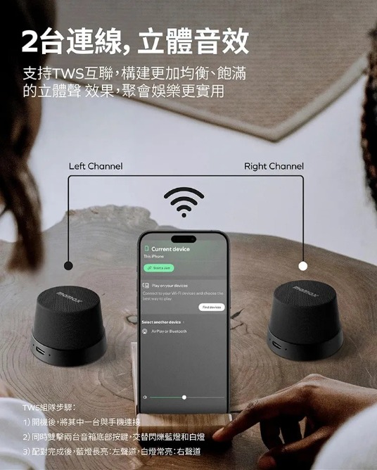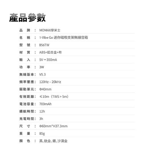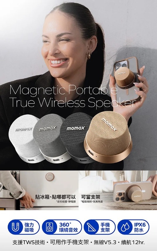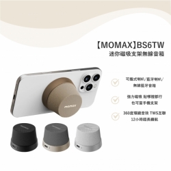 【MOMAX】BS6TW 迷你磁吸支架無線音箱 ‧ 可攜式喇叭/藍牙喇叭/無線藍牙音箱 ‧ 強力磁吸 貼哪裡都行 也可當手機支架 ‧ 360度環繞音效 TWS互聯 12小時超長續航 另有客製化印刷服務←點此可看更多資訊!歡迎詢問! Read More 更多其他產品 客製化案例