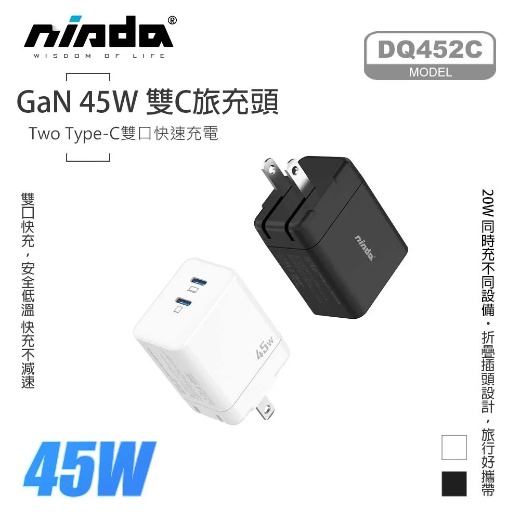 【NISDA】DQ452C - 45W氮化鎵 雙Type-C孔旅充頭