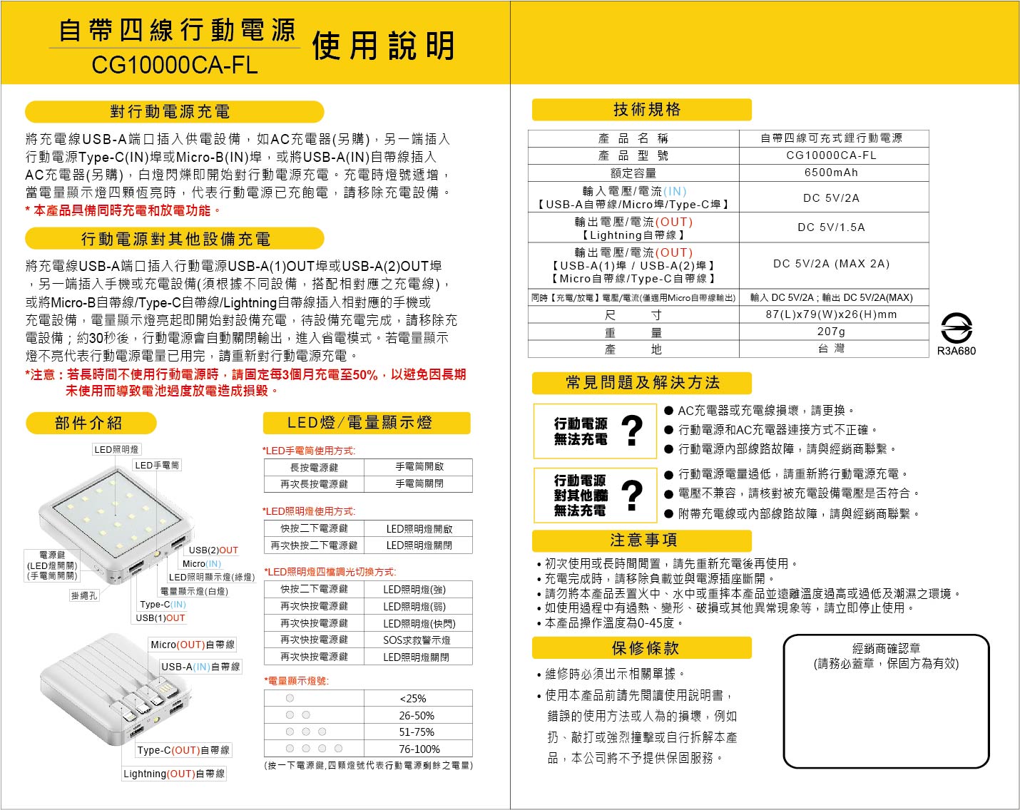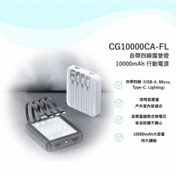 CG10000CA-FL - 自帶四線露營燈行動電源 • 自帶四線 安卓蘋果通用 (USB-A, Micro, Type-C, Lighting) • 照明高質量 戶外室內皆適合 另有客製化印刷服務 ←點此可看更多資訊! 更多其他產品 客製化印刷