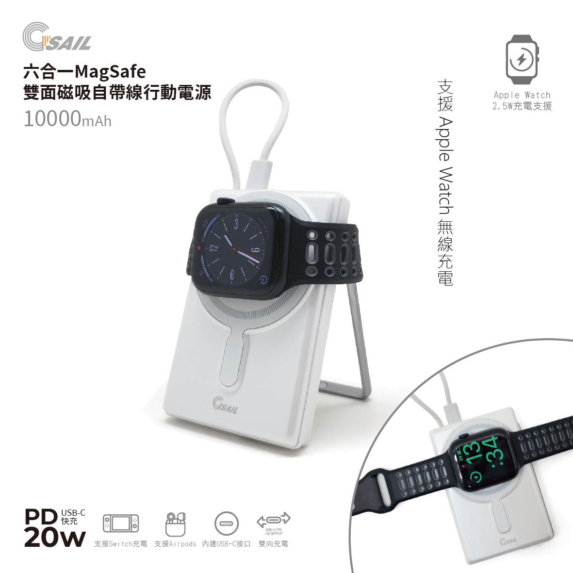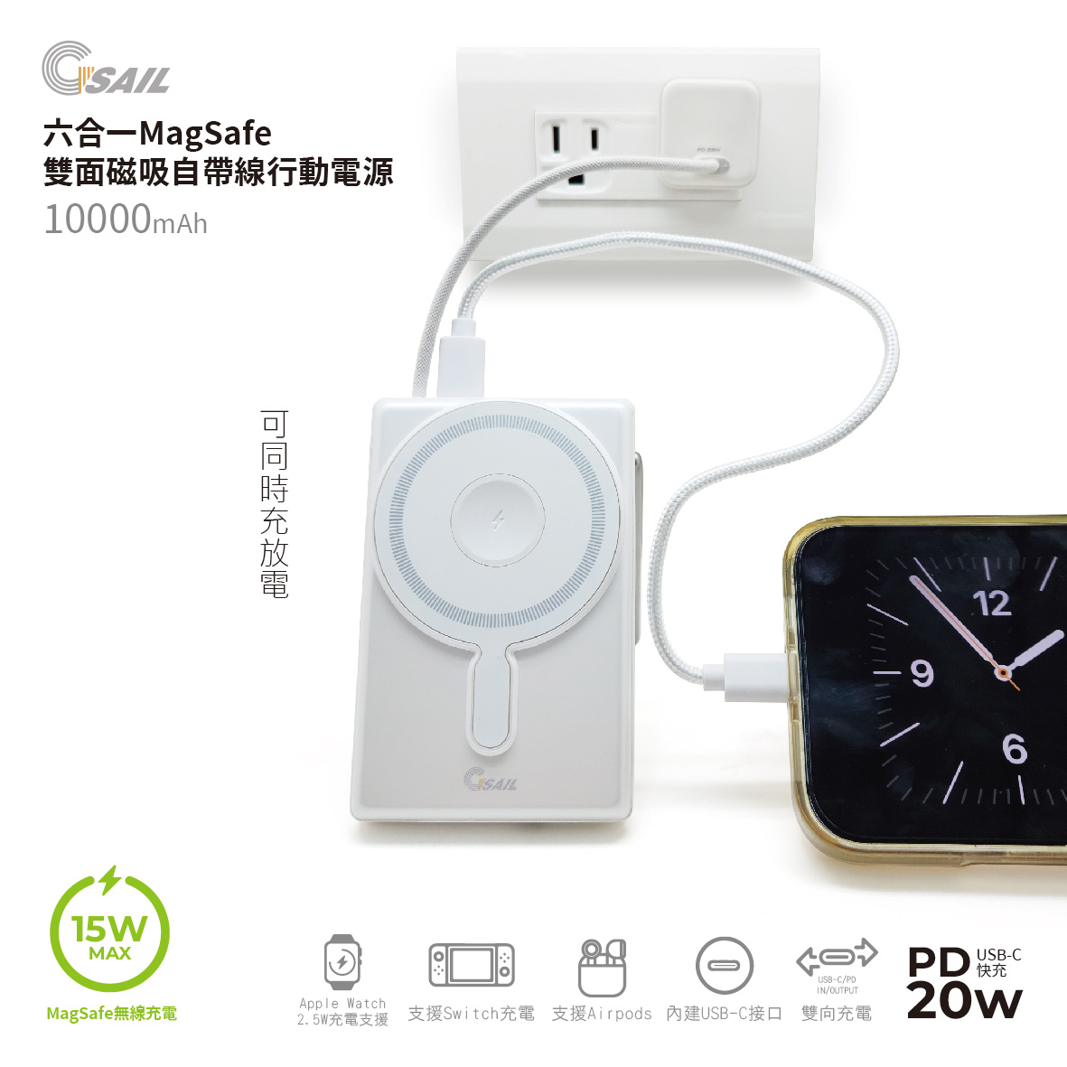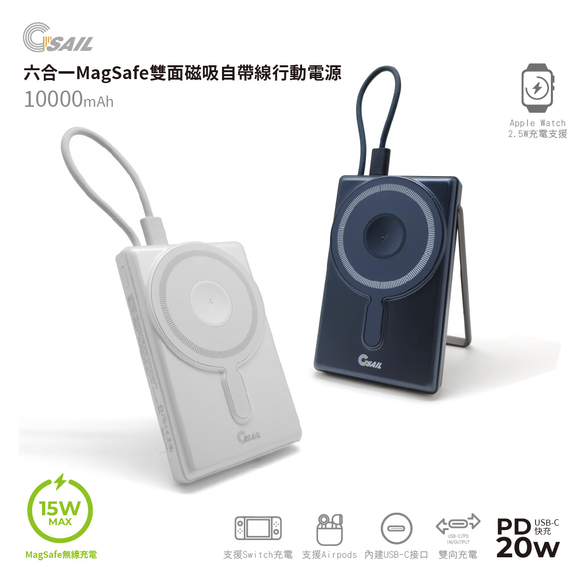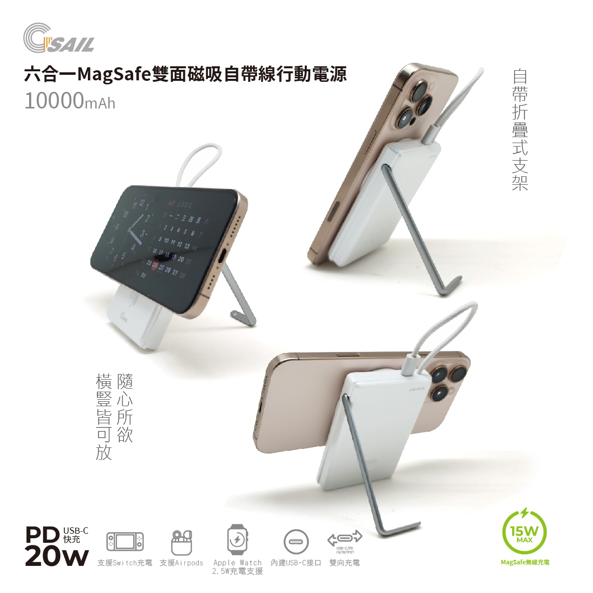 【Amass】GSPD565 - 15W六合一Magsafe雙向磁吸 自帶線行動電源 • 六合一多功能 • 雙面磁吸+自帶線 • 支援Apple watch • 支架支撐 另有客製化印刷服務 點此可看更多資訊! Read More 更多其他商品 客製化案例