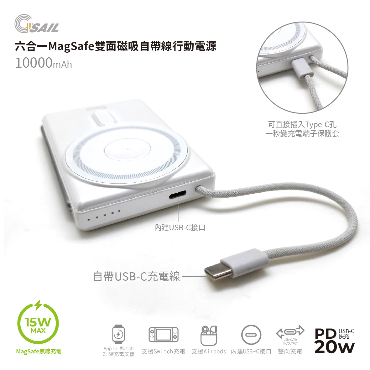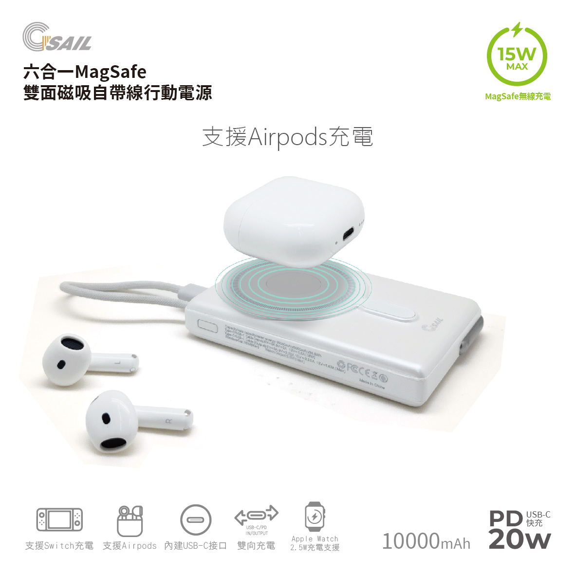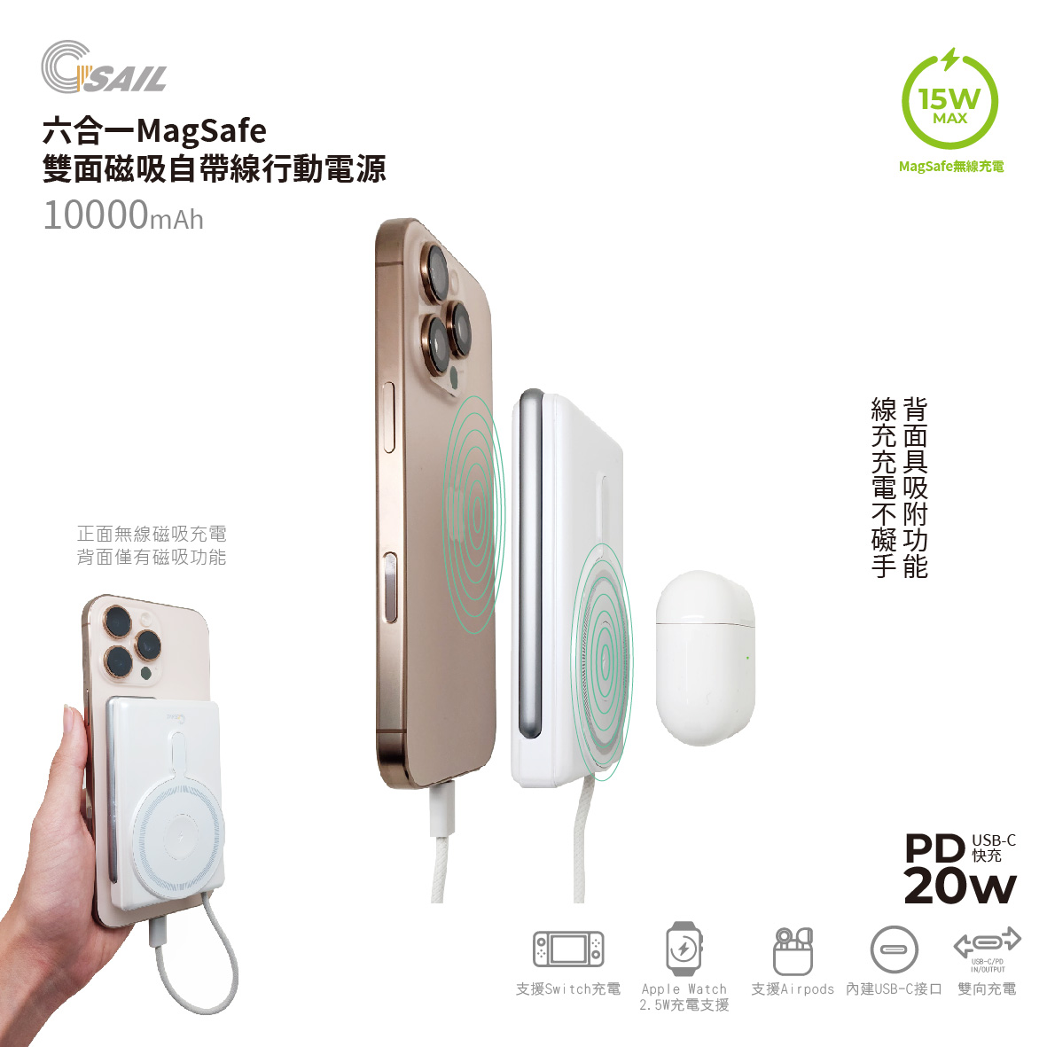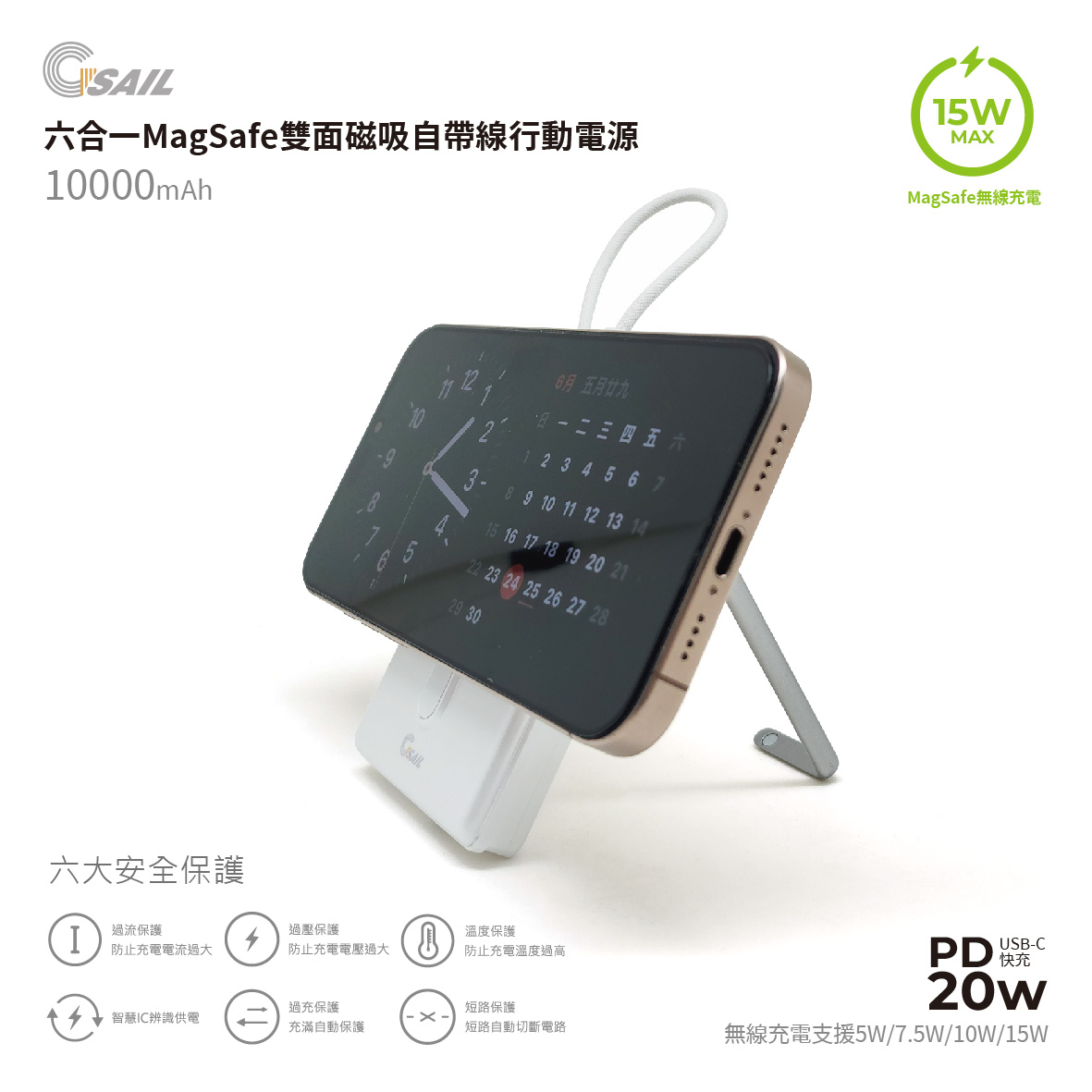 【Amass】GSPD565 - 15W六合一Magsafe雙向磁吸 自帶線行動電源 • 六合一多功能 • 雙面磁吸+自帶線 • 支援Apple watch • 支架支撐 另有客製化印刷服務 點此可看更多資訊! Read More 更多其他商品 客製化案例