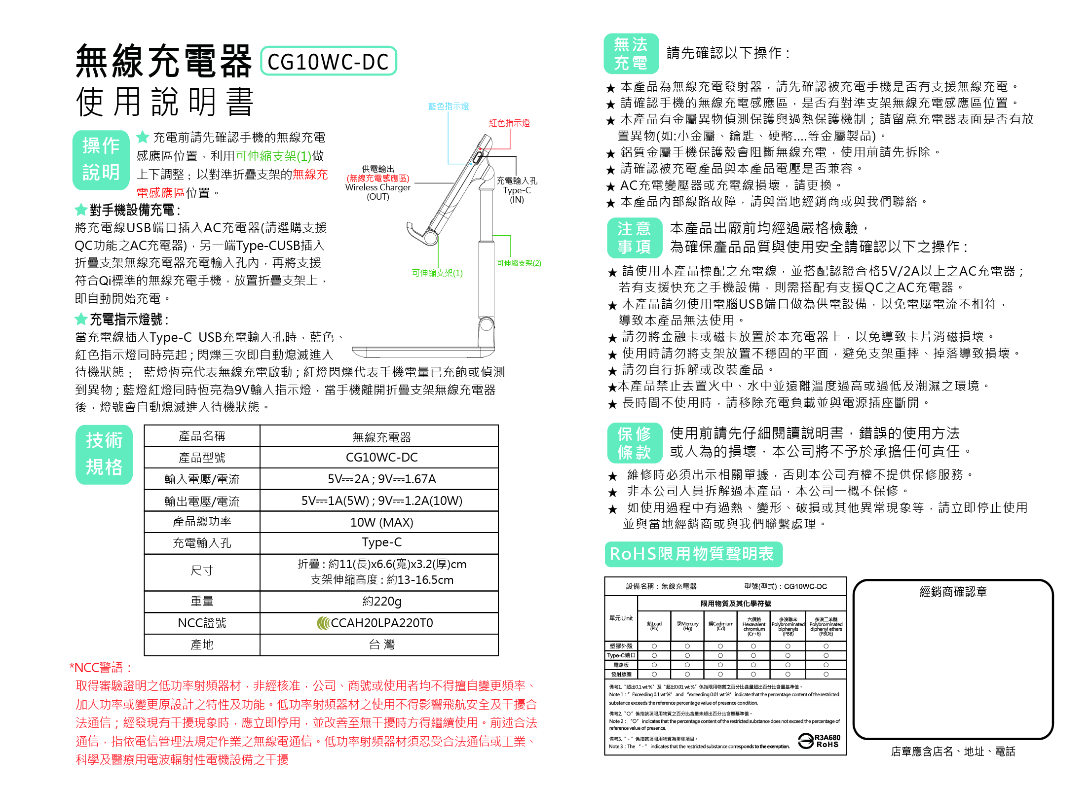 CG10WC-DC - 10W折疊支架無線充電器 ‧ 通過NCC認證/BSMI認證 .10W 無線快充(兼容蘋果7.5W快充) .感應面積增加 30% .兩段高度調整 .多種角度可調 .可摺疊收納攜帶 . FOD異物檢測功能 點此→可看客製化印刷服務內容 更多其他產品 客製化印刷 CG10WC-DC 摺疊支架無線充電-使用方法
